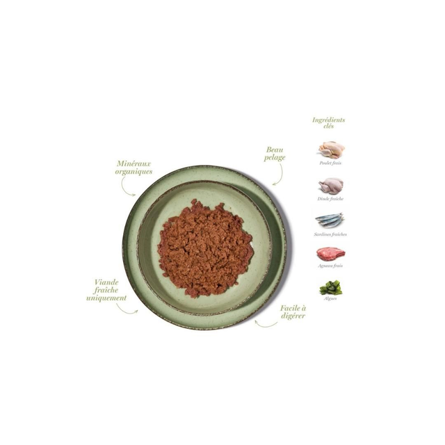 Composition : poulet, dinde, sardines et agneau 97 % (dinde fraîche 40 %, bouillon de dinde 26%, poulet frais 11 %, sardines fraîches 10%, agneau frais 10 %). Minéraux. Algues 0,02 %.