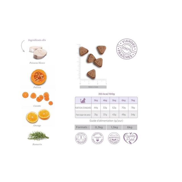 Composition : poissons blancs préparés frais 53%, petits pois entiers, protéines de pomme de terre, protéines de petits pois, lignocellulose, hydrolysat de poisson, pomme de terre déshydratée, levures, minéraux, graines de lin, tapioca, fibres de pomme, poudre de malt d'orge, farine de caroube, psyllium, chou kale déshydraté, krill de l’antarctique, algue, spiruline, paroi cellulaire hydrolysée de levures 1000 mg/kg, chicorée 1000 mg/kg, potiron déshydraté 1000 mg/kg, carotte déshydratée 1000 mg/kg, gingembre, extrait de mandarine, orange déshydratée 500 mg/kg, romarin 250 mg/kg, yucca schidigera.