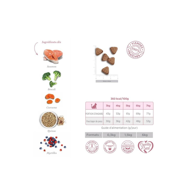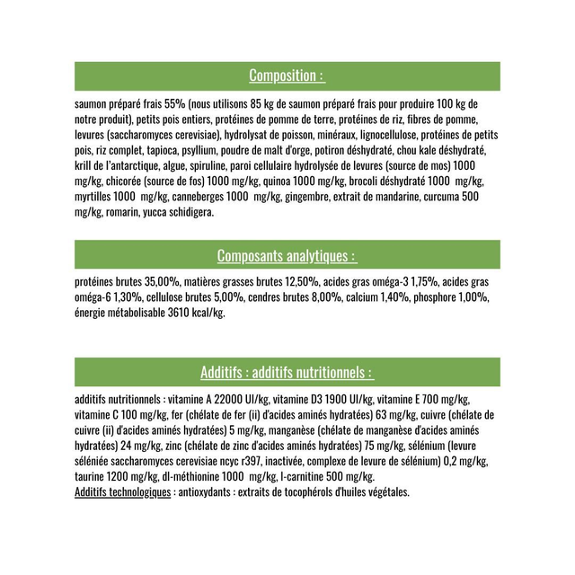 Composition : saumon préparé frais 55%, petits pois entiers, protéines de pomme de terre, protéines de riz, fibres de pomme, levures, hydrolysat de poisson, minéraux, lignocellulose, protéines de petits pois, riz complet, tapioca, psyllium, poudre de malt d'orge, potiron déshydraté, chou kale déshydraté, krill de l’antarctique, algue, spiruline, paroi cellulaire hydrolysée de levures, chicorée, quinoa, brocoli déshydraté, myrtilles, canneberges, gingembre, extrait de mandarine, curcuma, romarin, yucca schidigera.
